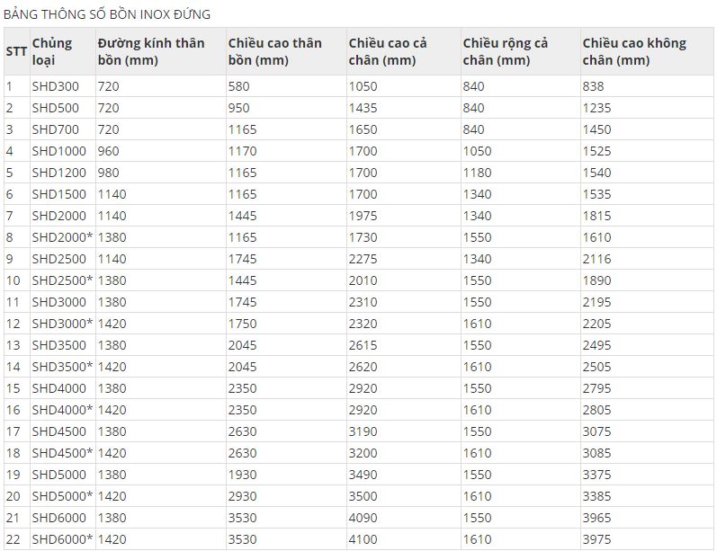 Thông số Bồn nước Inox 700 lít đứng Sơn Hà I304 (700l)
