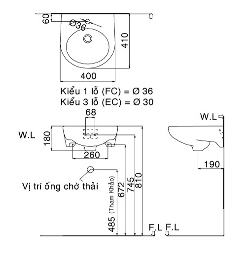 - EC: Chậu 3 lỗ gắn vòi 1 tay gạt