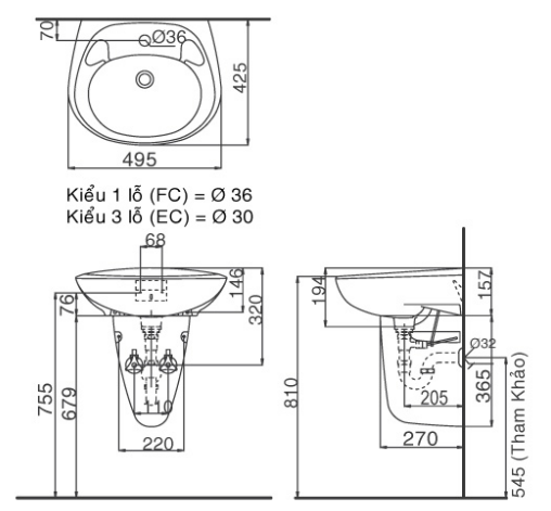 - EC: Chậu 3 lỗ gắn vòi 1 tay gạt
