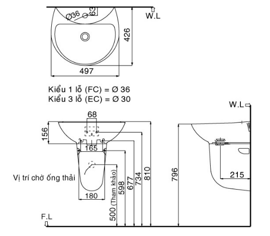 - EC: Chậu 3 lỗ gắn vòi 1 tay gạt