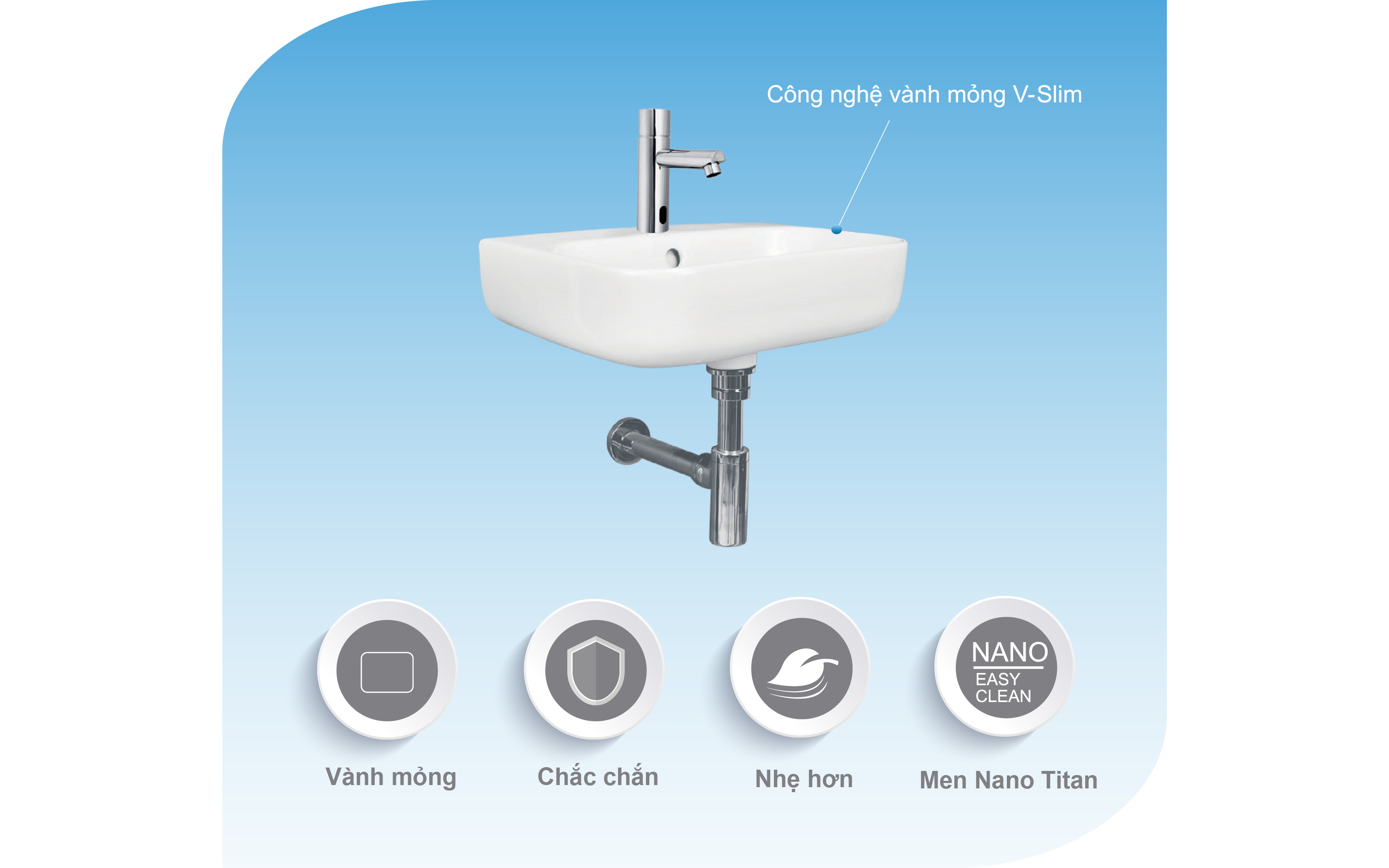 Chậu rửa treo tường Mekong nằm trong bộ sưu tập V-Slim của Viglacera. Với thiết kế vành mỏng tinh tế, tối giản và thanh lịch, V-Slim mang đến nét thẩm mỹ hiện đại cho phòng tắm và những trải nghiệm tiện nghi cho người sử dụng.